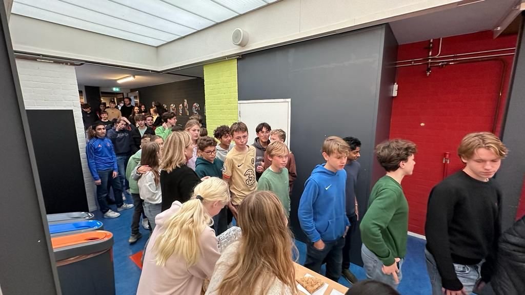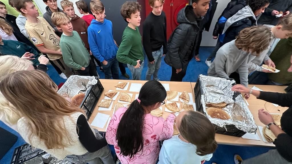 Als dank deden de (pannenkoeken)boerderij Meyendel en de school ook iets terug voor onze leerlingen. Tijdens het vijfde uur werden er maar liefst 1200 pannenkoeken uitgedeeld aan alle leerlingen. De kantinevloer kleeft nu nog van de stroop en de poedersuiker.