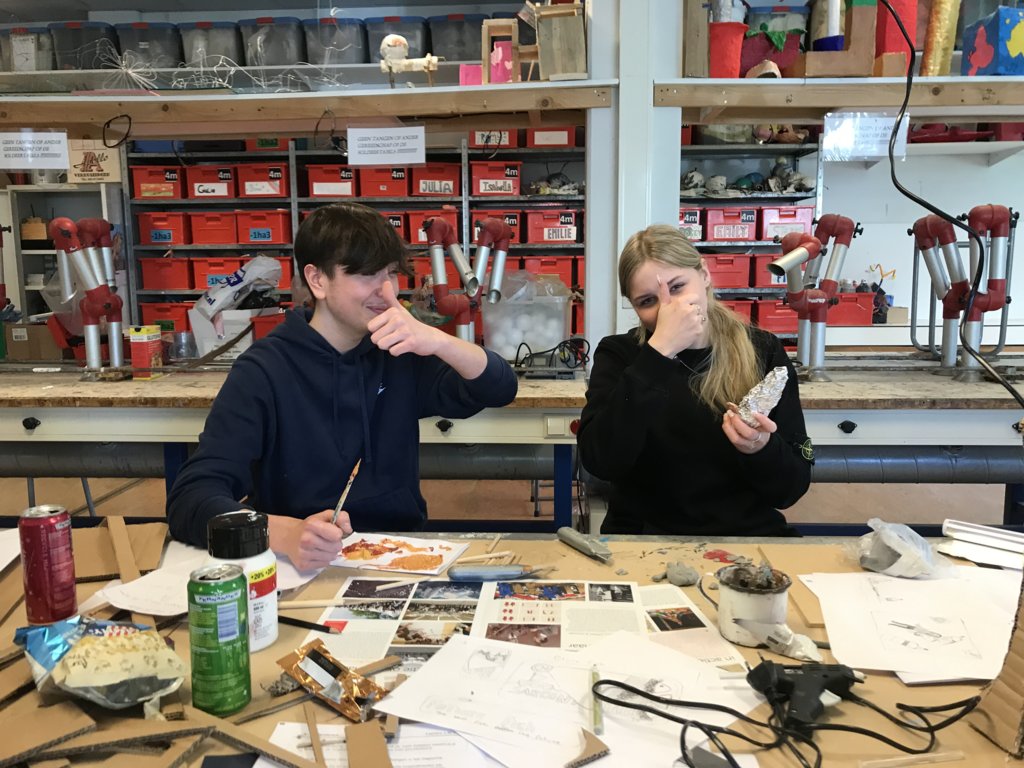 Op 4 en 5 april werken de leerlingen van 4M, 5H en 6V aan hun examenwerk voor de vakken handvaardigheid en beeldende vorming. De leerlingen van 5 havo maken hun schoolexamenwerk van de afgelopen week af. Zij werken met het thema 'Kunst & Leven'. De leerlingen van 6 vwo konden kiezen uit meerdere thema's voor hun praktische eindexamen en maken ook vandaag hun eindwerk af. Leerlingen uit 4 mavo mochten vandaag pas starten met hun praktische eindexamen, hun thema 'In Actie' werd vanochtend bekendgemaakt. Morgen werken de 4M leerlingen verder aan hun eindwerk. Zij ronden zo in twee dagen hun praktijkexamen af.