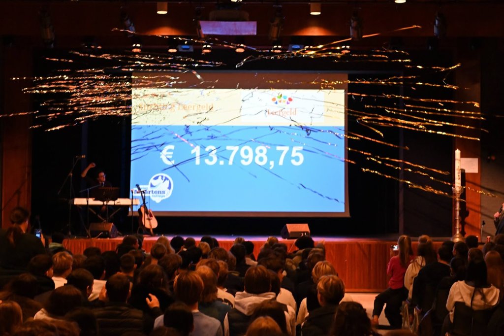 Tijdens de Maartensviering op 11 november werd de opbrengst van onze (lustrum) sponsorloop bekend gemaakt. We zijn er trots op dat we een cheque van maar liefst 13.798,75 euro konden overhandigen. Stichting Leergeld zorgt voor financiele ondersteuning bij kinderen in de regio Voorburg die het thuis wat minder breed hebben. In de traditie van Sint-Maarten vinden wij het belangrijk dat we samen delen en iets voor een ander doen.